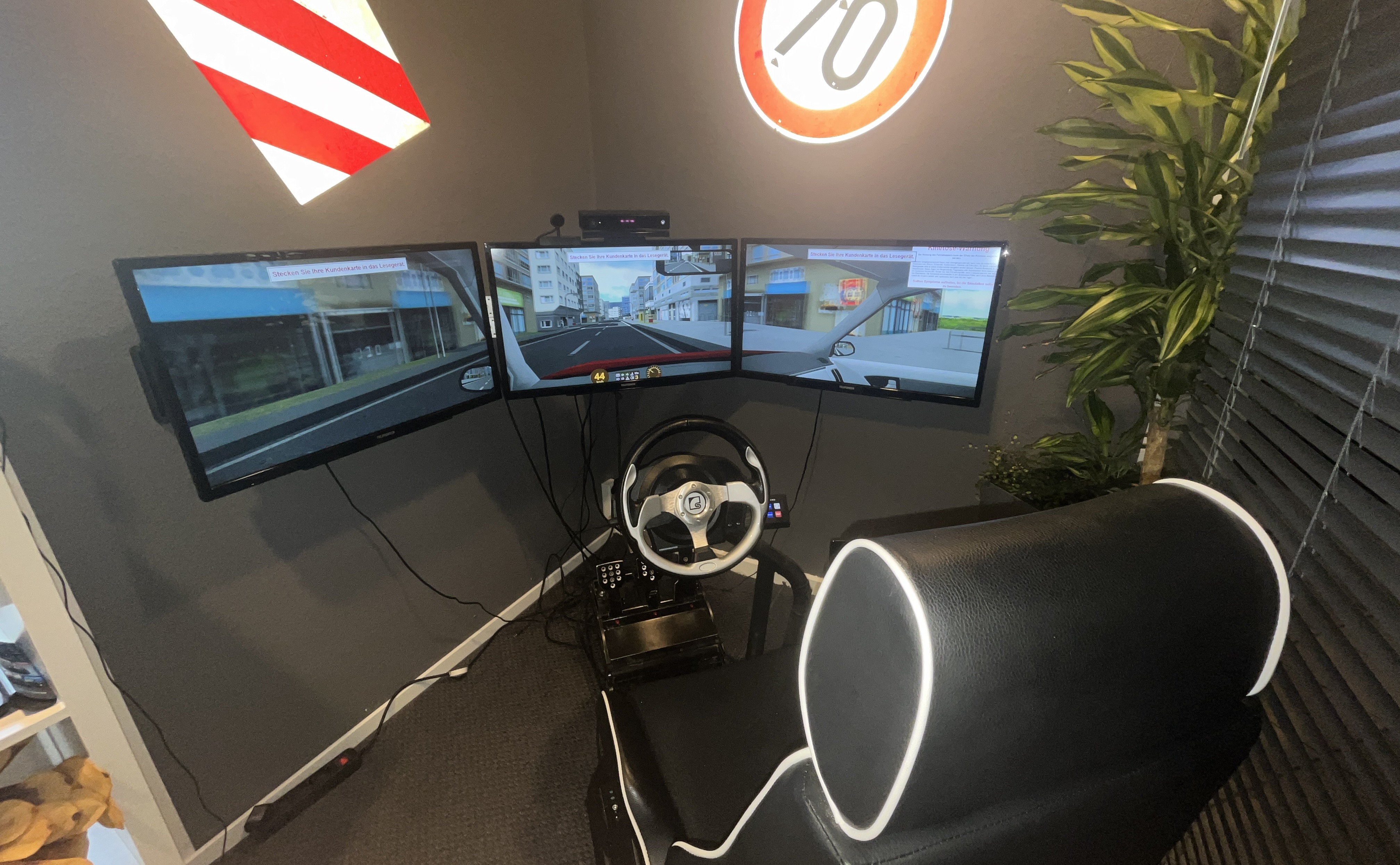 Unterstützt werden wir durch unseren elektronischen Kollegen: Ein Fahrsimulator mit VR Brille.